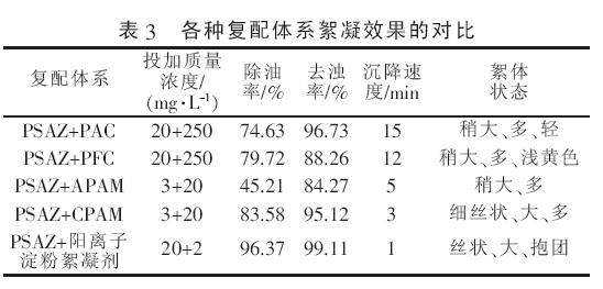 由表2 可知:6 種絮凝劑中,PAC?PFC?APAM?CPAM 對廢水中油的去除效果較差, 而PSAZ 和陽離子淀粉絮凝劑對油的去除效果相對較好?其原因是PSAZ 除了具有單元無機高分子絮凝劑的共同優(yōu)點外,其異核金屬離子的交錯排列能夠形成更長?更穩(wěn)定的分子鏈,一方面增加了其聚合度和分枝程度,使網(wǎng)捕作用加強; 另一方面金屬離子的引入增加了所帶的電荷量,使其吸附電中和能力提高,增加了其處理效果?陽離子淀粉絮凝劑的處理效果雖然次于PSAZ,但其沉淀速度是最快的,這就縮短了處理時間,提高了處理效率?各種復(fù)配體系絮凝效果的對比如表3 所示?