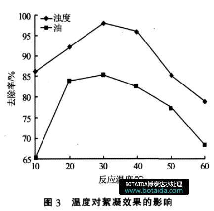 由圖3 可看出,隨著水溫的升高,絮凝效果亦相應(yīng)提高,在水溫為20~40 ℃時,其去除效果最佳;當(dāng)溫度升高到一定程度后,絮凝效果反而降低?究其原因主要是:在較低溫度時,水解反應(yīng)速度緩慢,水的黏度較大,導(dǎo)致膠體顆粒運動的阻力增大,絮體的生成速度降低,顆粒不易沉降?但水溫過高時,化學(xué)反應(yīng)速度亦加快,所形成之絮體較細小,同時絮體的水合作用增加,減緩了絮體的沉降速度,使絮凝效果降低?本試驗中室溫在25 ℃左右時,其處理效果最佳?