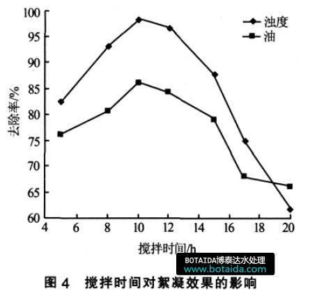 由圖4 可知,攪拌時間約10 min 時,絮凝效果最好?攪拌時間過長,將使本應(yīng)該沉淀的顆粒又分散成不能沉淀的細小顆粒,降低了絮凝效果;而攪拌時間過短,則會使絮凝劑和顆粒物不能充分接觸及吸附,從而不利于絮凝劑對膠體顆粒的捕集, 使絮凝劑的效能不能充分發(fā)揮.