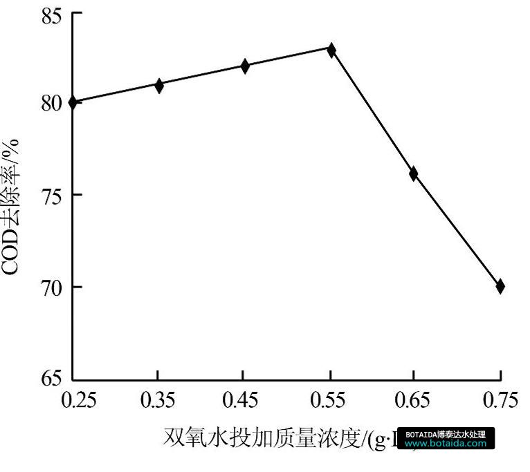 由圖3可知,隨著H2O2投加量的增加,廢水COD去除率增加,當H2O2投加質量濃度在0.55 g/L時COD去除率達到最大,為83%。隨后繼續(xù)增加,COD去除率開始下降,其原因是過量的H2O2直接將Fe2+氧化成Fe3++,消耗了H2O2并抑制了·OH的生成,污染物降解率降低。另外,殘留的H2O2也會干擾出水COD的測定。實驗選擇H2O2適宜的投加質量濃度為0.55 g/L。
