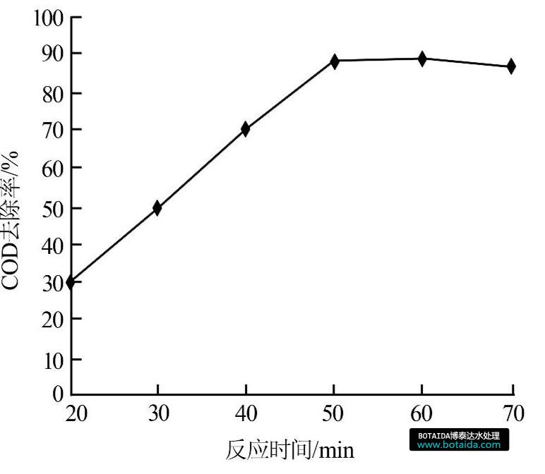 由圖5可知,隨反應時間的增加,COD去除率不斷增加。在反應進行到50 min時,COD去除率最高,達到88%。超過50 min后COD去除率基本不再變化,甚至有所降低。其原因是,反應時間延長可使電極反應的產物與廢水中污染物進行充分的電化學、吸附及絮凝等作用。但是反應時間過長會使更多的Fe2++被氧化成Fe3++,使色度增加,反應時間過長也會導致廢水中沉積物沉積在填料之間的空隙中,覆蓋于鐵和炭表面,阻礙了兩者的接觸,抑制反應的進行。而且反應時間的延長,會使反應器的容積增加、建筑面積增加,基建費用和設備投資費用增加。因此將最佳反應時間定為50 min。