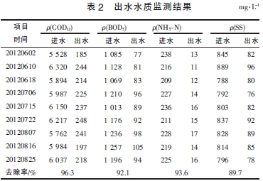 系統(tǒng)經(jīng)過2個月調(diào)試后,各項測試指標均達到污水處理廠的接管標準。運行結(jié)果表明,該系統(tǒng)運行穩(wěn)定,抗沖擊負荷能力強。環(huán)保部門抽檢及企業(yè)自檢結(jié)果顯示,廢水各項指標均穩(wěn)定達標。近期運行數(shù)據(jù)見表2。由表2 可見,廢水經(jīng)過“預處理-UASB-二級接觸氧化”工藝處理后,平均去除效率分別為CODCr96.3%,BOD5 92.1%,NH3-N 93.6%,SS 89.7%,出水監(jiān)測指標均優(yōu)于接管標準。