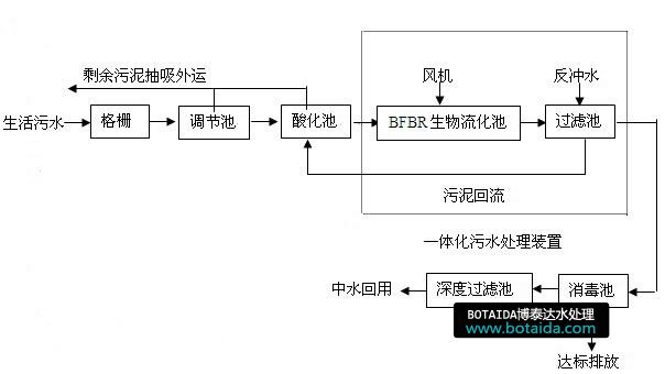 污水經(jīng)格柵后進(jìn)入調(diào)節(jié)池,進(jìn)行水力水量調(diào)節(jié),之后進(jìn)入酸化池酸化(兼有沉淀作用),然后進(jìn)入BFBR生物流化池進(jìn)行生物降解及氧化處理,并經(jīng)過(guò)濾池過(guò)濾,再經(jīng)過(guò)加氯消毒,即可達(dá)標(biāo)排放,若再經(jīng)過(guò)深度過(guò)濾處理,即可作中水回用。