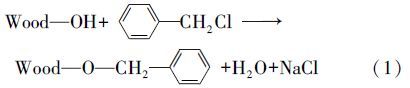 參照文獻(xiàn)(王東華等,2000)方法,在帶有攪拌機(jī)、溫度計和回流裝置的250 mL三口燒瓶中,加入20.0 g脫脂杉木粉和10% NaOH水溶液80~120 mL,攪拌均勻后讓其潤脹 30 min,然后加入 80~120 mL氯化芐和80 mL甲苯,攪拌下于110 ℃ 油浴中加熱反應(yīng)到設(shè)定時間,冷卻并加入少量水,抽濾,分別用50 mL 50%乙醇洗滌兩次,100 mL水洗滌兩次,再用50 mL 95%乙醇洗滌兩次,抽干,在60 ℃下干燥至恒重,得芐基化杉木粉,簡稱“芐基化木粉”,轉(zhuǎn)入干燥器中,并計算增重百分率(WPG).木粉芐基化改性的化學(xué)反應(yīng)式如下: