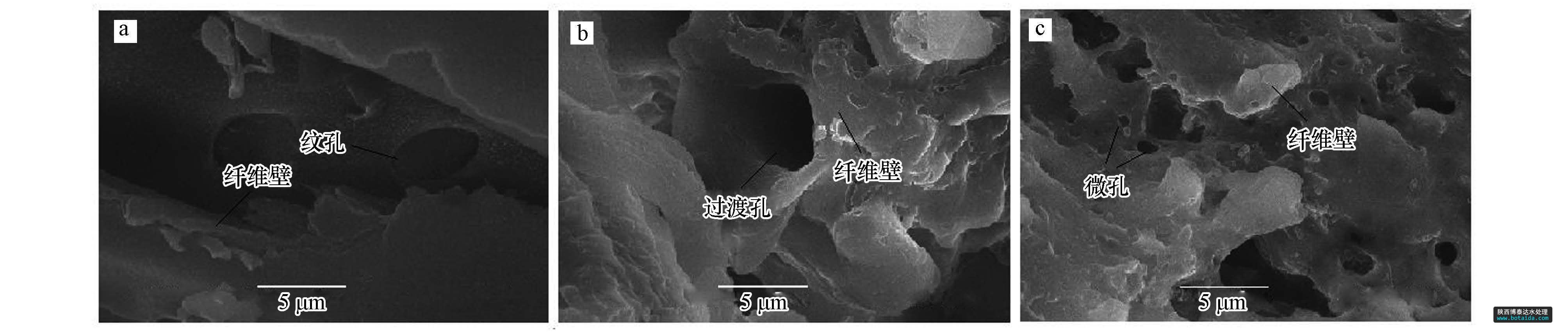 用JSM-6380LV掃描電鏡對原木粉、芐基化木粉、多微孔芐基化木粉進(jìn)行了分析(圖 4).對比原木粉(圖 4a)和芐基化木粉(圖 4b)發(fā)現(xiàn),原木粉中封閉的紋孔清晰可見,纖維壁堅硬、平整.原木粉經(jīng)芐基化改性后(圖 4b),紋孔膜破裂,纖維壁膨松、柔軟,過渡孔清晰可見.芐基化木粉經(jīng)水熱處理后得到多微孔芐基化木粉(圖 4c),纖維壁明顯破裂,產(chǎn)生了許多微孔.這一方面是由于水蒸汽分子具有高能量、高穿透力,可將芐基化木粉纖維壁上的微纖絲部分沖破,并造成斷裂,產(chǎn)生新的微孔或超微孔(王瑀,2008);另一方面,在高熱水蒸汽分子沖擊下,芐基化木粉結(jié)晶區(qū)中纖維素的氫鍵斷裂,纖維分子從彎曲狀態(tài)變成伸展?fàn)顟B(tài),纖維壁伸展開來,產(chǎn)生了明顯的“膨化效應(yīng)”,有效地擴(kuò)大了芐基化木粉的過渡孔和微孔.此外,水熱處理中所加乳化劑OP-10能迅速乳化從纖維壁間釋放出的膠狀物質(zhì),有利于及時清洗疏通孔道.由此可見,木粉經(jīng)芐基化及水熱處理后,木材纖維壁變得膨松,產(chǎn)生大量的微孔或超微孔,有效地擴(kuò)大了芐基化木粉吸附重金屬離子的比表面積,同時使纖維素和半纖維素分子上的羥基更加裸露,增加了對重金屬離子絡(luò)合的羥基數(shù)目,從而提高了對重金屬離子的吸附性能.