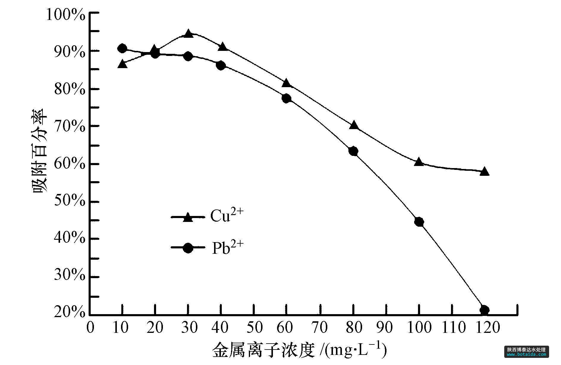 圖9 不同初始濃度對Cu2+和Pb2+吸附百分率的影響