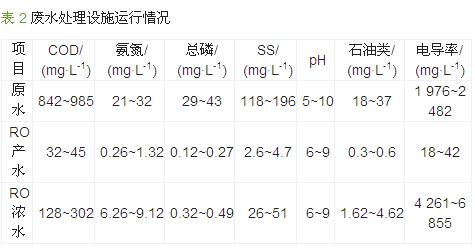 脫脂廢水、磷化廢水、噴漆廢水和電泳廢水等機(jī)械加工廢水的有機(jī)物濃度較高,且含有礦物油、懸浮物和氮磷等污染物。通過氣浮和混凝沉淀處理可將COD降低到700 mg/L左右,生物系統(tǒng)(缺氧和好氧工藝)可將COD降低到70 mg/L左右,出水可穩(wěn)定達(dá)標(biāo)排放。實際運行時首先投加NaOH將廢水pH調(diào)至8.5~9.0,然后按照3、5、1.0 mL/L的投加量分別加入5%(質(zhì)量分?jǐn)?shù),下同)的CaCl2溶液、10%的聚合氯化鋁和5%的聚丙烯酰胺溶液,混合反應(yīng)60 min后進(jìn)入氣浮池,氣浮出水按6、1.5 mL/L投加量分別投加10%的聚合氯化鋁和5%的聚丙烯酰胺溶液,混凝沉淀出水最后進(jìn)入生物處理系統(tǒng),生化出水經(jīng)砂濾器、炭濾器、超濾、保安過濾器和反滲透深度處理后回用于生產(chǎn),反滲透濃水可達(dá)到GB 8978—1996三級標(biāo)準(zhǔn)。該工程已穩(wěn)定運行4 a多,從實際檢測結(jié)果來看,反滲透產(chǎn)水COD穩(wěn)定在32~45 mg/L,電導(dǎo)率穩(wěn)定在18~42 μS/cm,可滿足生產(chǎn)用水水質(zhì)要求;反滲透濃水COD穩(wěn)定在128~302 mg/L,SS穩(wěn)定在26~51 mg/L,達(dá)到GB 8978—1996三級標(biāo)準(zhǔn)后達(dá)標(biāo)排放,其主要水質(zhì)指標(biāo)如表 2所示。