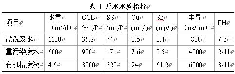 某電子公司是國內(nèi)重點集成電路封裝測試企業(yè),該公司主要從事半導(dǎo)體集成電路、半導(dǎo)體元器件的封裝測試業(yè)務(wù),其生產(chǎn)線廢水主要包括兩部分,一部分為晶元的減薄劃片廢水、另一部分為電鍍錫化廢水。減薄劃片廢水中主要含有大量的硅粉微粒,SS約2000mg/L左右,特性很穩(wěn)定,不易沉降,電導(dǎo)率僅為2-4µs/cm,東洋采用自主研發(fā)的二級連續(xù)UF膜系統(tǒng)進(jìn)行進(jìn)行廢水回收利用,廢水回收利用率≥90%,回收水質(zhì)好,同時回收硅粉。在此主要介紹電鍍錫化廢水的回用處理系統(tǒng);廢水中主要含有Cu、Sn、酸堿、有機物等,在該項目中首先要做好分質(zhì)分流是尤為重要,把錫化電鍍線上的廢水按照水中的成份及濃度來分質(zhì)收集,主要分為漂洗廢水、重污染廢水、有機槽廢液三路,水質(zhì)如下: