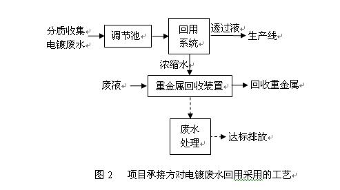 經(jīng)過多年電鍍廢水及涉重金屬的研究及工程實踐,摸索出一套成熟穩(wěn)定的電鍍廢水回用技術(shù)(連續(xù)錯流抗污染多級膜法回用),把電鍍廢水分質(zhì)收集,單獨膜法回用,回用水可分別用到對應(yīng)的生產(chǎn)線或作為自來水使用;目前項目承接方采用的回用理念是“先回用后處理”,把廢水先進(jìn)行分質(zhì)收集,單獨膜法回用,回收率≥85%,濃縮后的廢水中重金屬離子濃度可提升到100倍以上,對該濃縮廢水可通過重金屬回收裝置(專利號:CN201010578758.5)進(jìn)行重金屬的提取,大大提高了重金屬的回收效率,回收重金屬的同時,也減輕后需廢水處理的負(fù)荷。