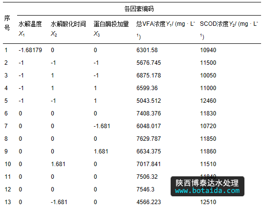 根據(jù)CCD(Central Composite Designs)中心組合試驗(yàn)設(shè)計(jì)原理,在前期單因素試驗(yàn)的基礎(chǔ)上,選擇水解溫度、水解酸化時(shí)間和蛋白酶投加量作為自變量,分別用X1、X2、X3表示,以總VFA濃度和SCOD濃度作為響應(yīng)值,分別用Y1、Y2表示,進(jìn)行響應(yīng)面試驗(yàn)因素水平安排,具體見(jiàn)表 1.由Design Expert 8.0.6(Stat-Ease),采用CCD試驗(yàn)設(shè)計(jì)原理,得到3因素3水平共20個(gè)試驗(yàn)點(diǎn)的試驗(yàn)方案,并對(duì)試驗(yàn)數(shù)據(jù)進(jìn)行二次多元回歸擬合.二次多元回歸方程為: