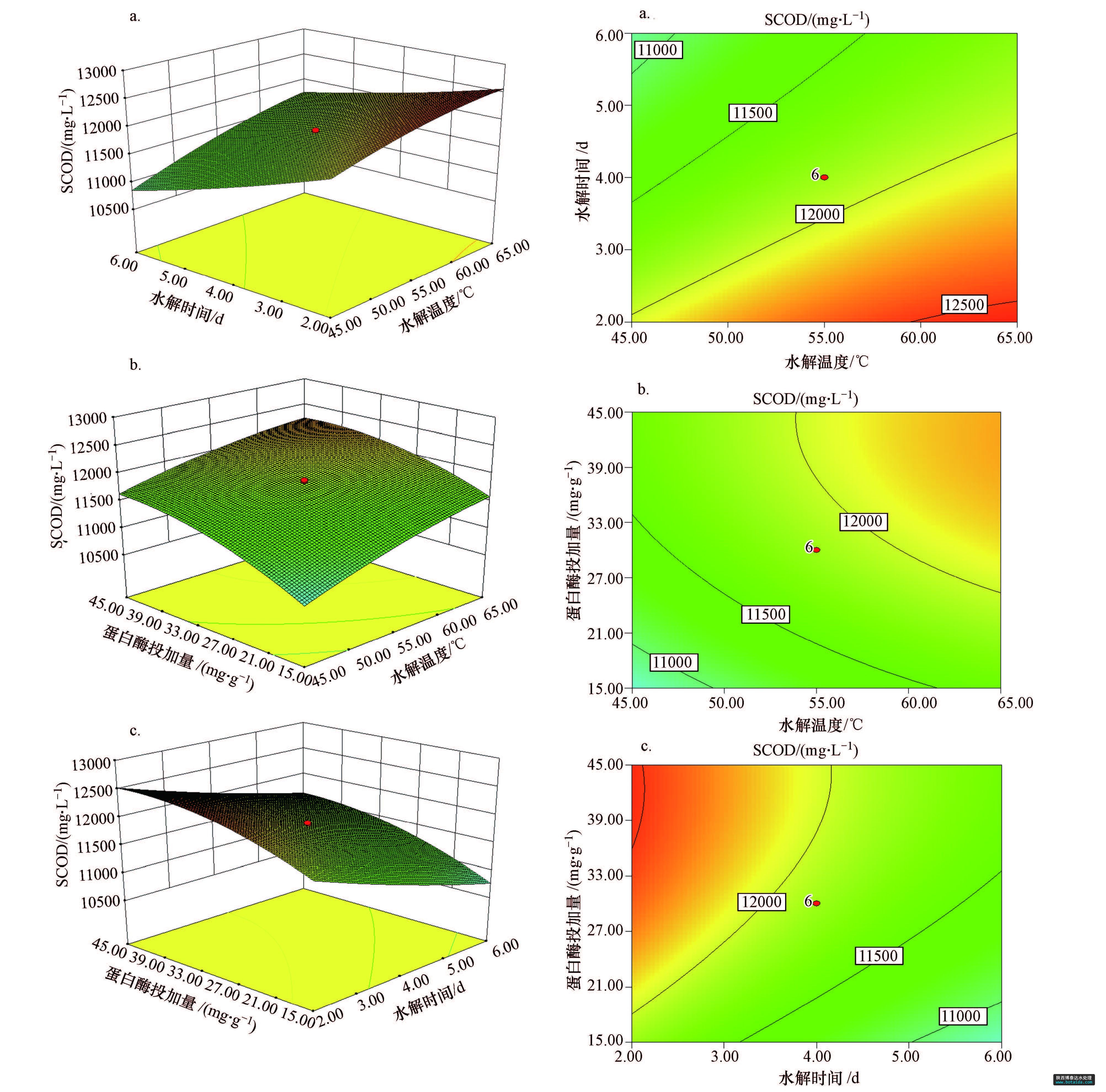 圖2 不同因素對(duì)SCOD濃度影響的響應(yīng)曲面圖和等高線圖(a.水解酸化時(shí)間和水解溫度,b.蛋白酶投加量和水解溫度,c.蛋白酶投加量和水解酸化時(shí)間)
