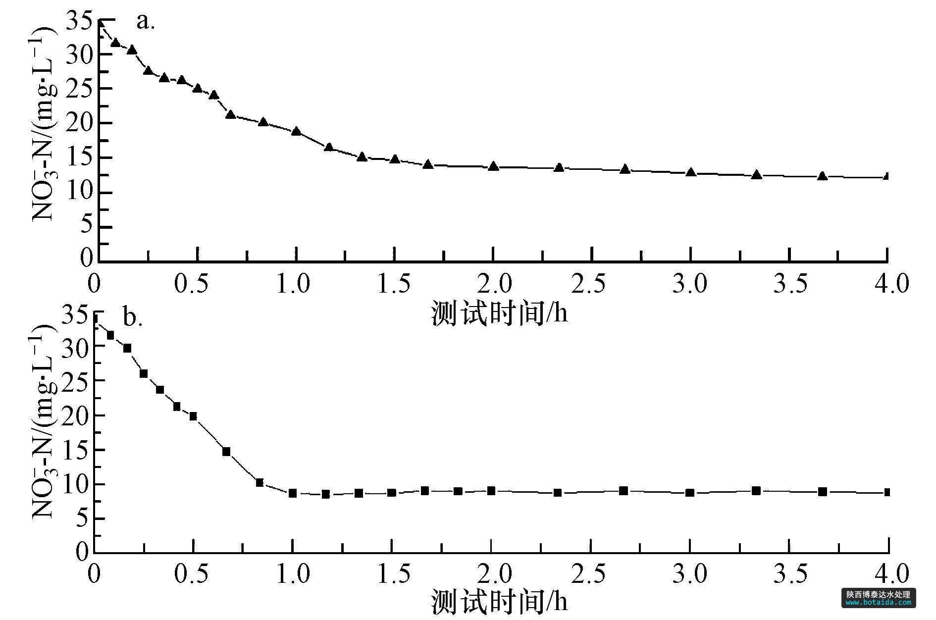 圖5 反硝化測(cè)試曲線(a.未優(yōu)化組(僅MW-H2O2-OH預(yù)處理)的污泥上清液(徐榮樂(lè),2014);b.優(yōu)化組(MW-H2O2-OH預(yù)處理并去除殘留H2O2+水解酸化)的污泥上清液)