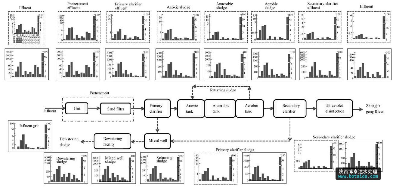 2012年4月份則采集了該廠各個(gè)構(gòu)筑物的出水和污泥樣品,采樣點(diǎn)和類(lèi)型見(jiàn)圖 1.我們?cè)?4: 00—17: 00之間,每個(gè)小時(shí)分別采集該構(gòu)筑物的污水和污泥樣品,然后分別將污水和污泥樣品混合在一起作為一個(gè)混合樣.污水和污泥樣品是分別用干凈的棕色玻璃瓶和廣口瓶采集的,每個(gè)采集瓶上方不留空間,采集完之后立馬放入冰袋中,并運(yùn)到實(shí)驗(yàn)室保存.