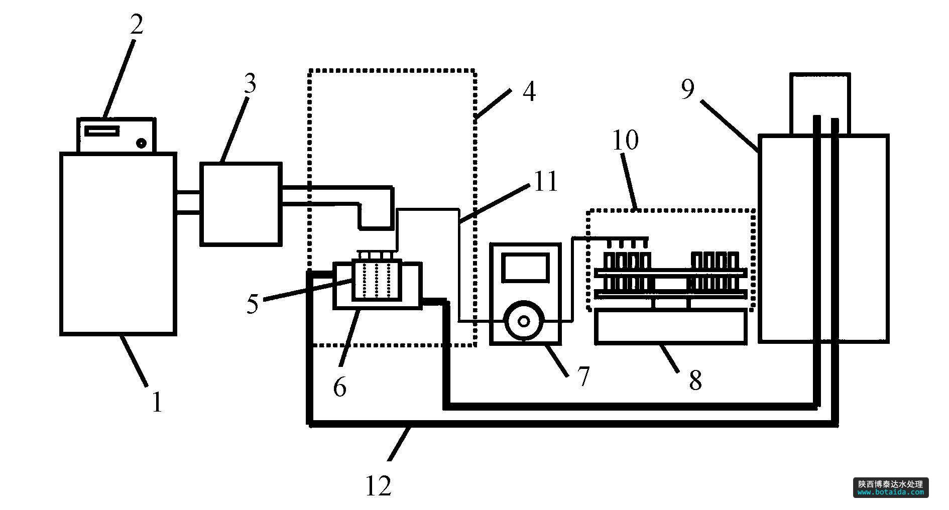 圖1 單線(xiàn)態(tài)氧捕獲裝置示意圖(1.光源,2.光強(qiáng)調(diào)節(jié)器,3.單色儀,4.暗室,5.多通量反應(yīng)杯,6.冷阱,7.恒流泵,8.部分收集器,9.恒溫循環(huán)水,10.遮光罩,11.采樣管路,12冷凝水管路)