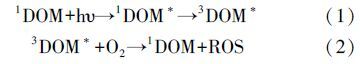 溶解性有機(jī)質(zhì)(DOM)含有發(fā)色基團(tuán),是重要的天然光敏劑,在紫外輻射或太陽(yáng)光照射下,單線(xiàn)態(tài)(state DOM singlet,1DOM)分子吸收光能先轉(zhuǎn)化為激發(fā)單線(xiàn)態(tài)(excited state DOM singlet,1DOM*),進(jìn)而轉(zhuǎn)化為激發(fā)三線(xiàn)態(tài)(excited state DOM triplets,3DOM*),進(jìn)一步與溶解氧分子發(fā)生一系列反應(yīng),產(chǎn)生活性氧物質(zhì)(reactive oxygen species,ROS),如羥基自由基(hydroxyl radical,· OH)、單線(xiàn)態(tài)氧(singlet oxygen,1O2)、超氧化物(superoxide,O2-)等(見(jiàn)反應(yīng)式(1)、(2.這些活性氧物質(zhì)可以誘導(dǎo)有機(jī)污染物光降解,同時(shí),DOM也會(huì)與目標(biāo)化合物競(jìng)爭(zhēng)光吸收,或猝滅目標(biāo)化合物的激發(fā)態(tài),DOM對(duì)有機(jī)污染物的光解具有光敏化和光屏蔽雙重作用(Chen et al., 2009;,這與DOM的來(lái)源、組成、化學(xué)結(jié)構(gòu)等特點(diǎn)密切相關(guān).因此,溶解性有機(jī)質(zhì)在水生生態(tài)系統(tǒng)光化學(xué)中扮演重要角色,可以影響有機(jī)污染物的環(huán)境行為和生態(tài)風(fēng)險(xiǎn).