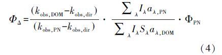 式中,Iλ表示光源在每個(gè)波長(zhǎng)下的光照強(qiáng)度(W · m-2);aλ,DOM和aλ,PN分別表示腐殖酸和光敏劑在每個(gè)波長(zhǎng)處的納氏吸收系數(shù)(m-1),可由公式(5)計(jì)算得到;Sλ是屏蔽因子,無(wú)量綱,可由公式(6)計(jì)算得到.