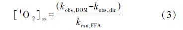 一般采用單線(xiàn)態(tài)氧平衡濃度(singlet oxygen steady-state concentrations,[1O2]ss)對(duì)腐殖酸產(chǎn)生1O2的產(chǎn)量進(jìn)行表征.FFA作為對(duì)1O2的捕獲劑,其降解的快慢可以反映產(chǎn)生1O2的速率.[1O2]ss可由FFA降解速率常數(shù)kobs,DOM和FFA自身光降解速率常數(shù)kobs,dir經(jīng)公式(3)計(jì)算得到.