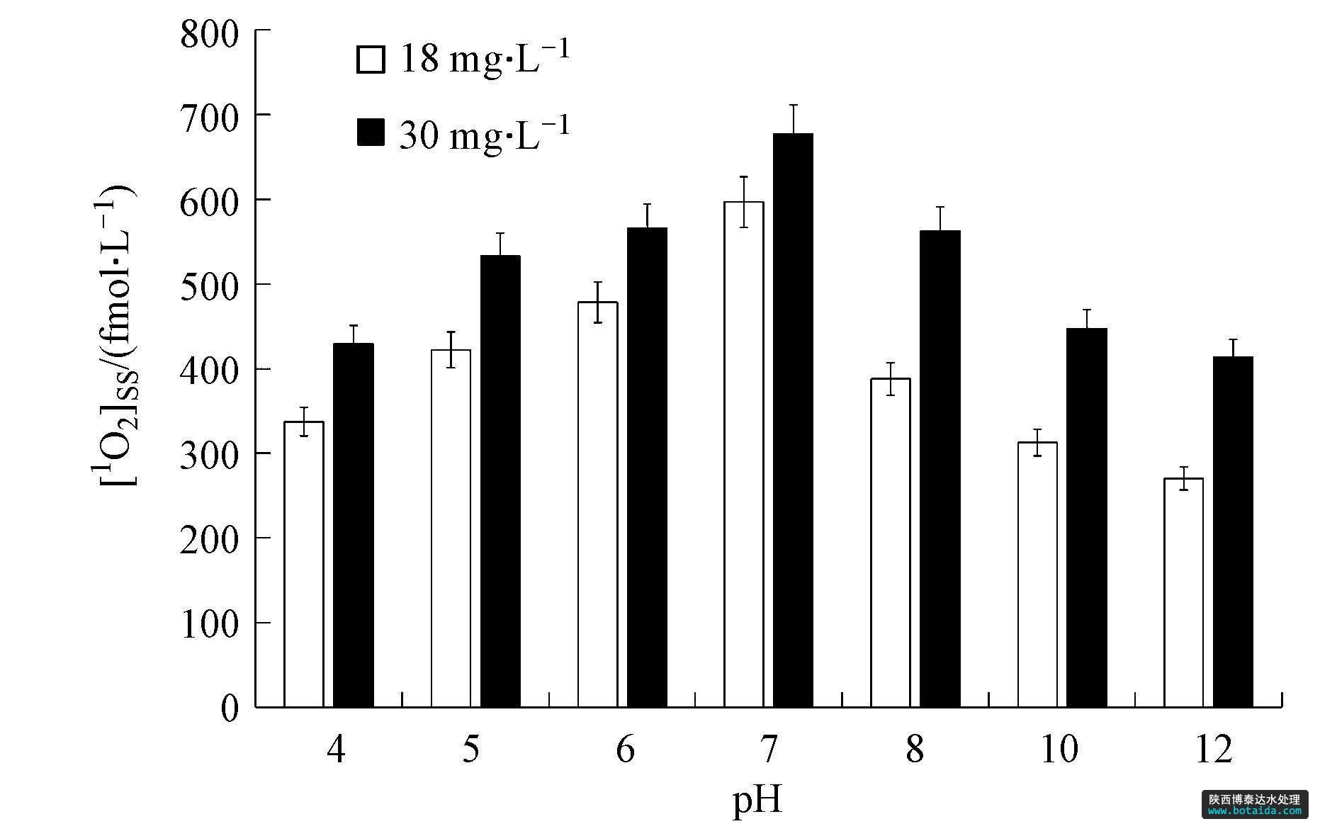pH作為水環(huán)境中重要的理化性質(zhì)指標(biāo),對(duì)水中DOM的水化學(xué)、光化學(xué)等行為的解釋和預(yù)測(cè)具有重要作用(Frimmel et al., 1987; Dalrymple et al., 2010).圖 2為不同pH條件下,腐殖酸光敏化產(chǎn)生1O2的平衡濃度. [1O2]ss 值在pH=7的溶液中最高,其中DOC值為18 mg · L-1和30 mg · L-1的腐殖酸溶液產(chǎn)生的[1O2]ss分別為596.9 fmol · L-1和677.3 fmol · L-1.隨著酸堿性增強(qiáng),[1O2]ss值逐漸減小,但弱酸環(huán)境中的[1O2]ss值較弱堿環(huán)境中的高.