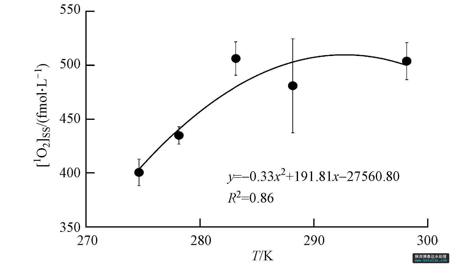 為模擬實(shí)際水環(huán)境,本研究所選溫度段為1.5、5、10、15和25 ℃,[1O2]ss與T(T為絕對(duì)溫度)的關(guān)系如圖 4所示.實(shí)驗(yàn)溫度范圍內(nèi),[1O2]ss值為400~506 fmol · L-1,隨T增大呈增長(zhǎng)趨勢(shì).分析推測(cè)溫度升高,溶液中分子活躍度增強(qiáng),使得HA吸收光子能量發(fā)生能級(jí)躍遷生成三線(xiàn)激發(fā)態(tài)(3HA*)的速率增大,使得更多的氧分子獲得3HA*轉(zhuǎn)移的能量形成1O2.