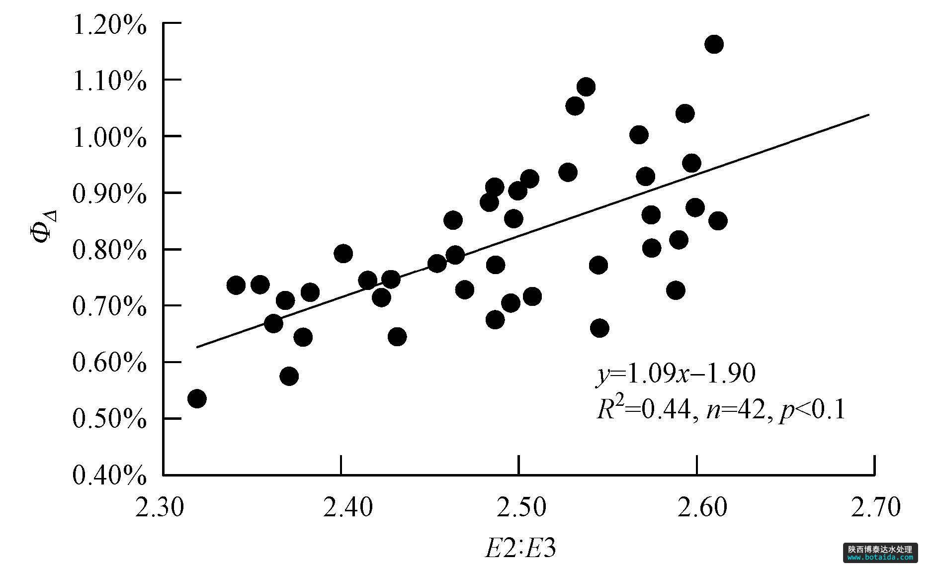 本研究選光譜特征值E2:E3與ФΔ值進(jìn)行相關(guān)分析,所得關(guān)系圖見(jiàn)圖 6.量子產(chǎn)率ФΔ與E2:E3顯著正相關(guān)(p<0.01),線(xiàn)性擬合所得方程為y=1.09x-1.90,R2=0.44.Petersone et al.(2012)針對(duì)水體DOM的研究結(jié)果顯示,ФΔ與E2:E3之間成正相關(guān)(y=0.196 x+0.605,R2=0.592).本研究中ФΔ與E2:E3的線(xiàn)性相關(guān)擬合斜率(1.09)顯著大于Petersone et al.(2012)研究結(jié)果(0.196),可能因本研究腐殖酸與他人研究樣品相比有機(jī)質(zhì)類(lèi)型不同且較為單一所致.E2:E3作為表征DOM的芳香性和分子量的特征值(Peuravuori and Pihlaja, 1997;Dalzell et al., 2009),其差異可以反映有機(jī)質(zhì)類(lèi)型的不同.Petersone et al.(2012)的研究中5﹤E2:E3﹤25,有機(jī)質(zhì)類(lèi)型多樣,以小分子量的DOM為主;而本研究中E2:E3值較小且范圍窄(2.32~2.61),有機(jī)質(zhì)類(lèi)型單一,腐殖酸分子量大,芳構(gòu)化程度高.這表明,存在單線(xiàn)態(tài)氧量子產(chǎn)率隨有機(jī)質(zhì)分子量減小及芳香性減弱而增大的趨勢(shì),且對(duì)于高分子量的DOM,該趨勢(shì)更為顯著.