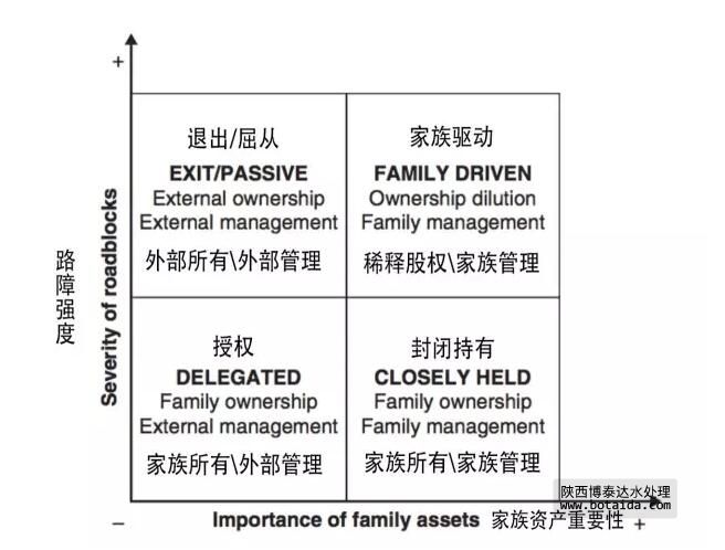 家族企業(yè)路線圖為家族可以選擇的路線提供了一個非常簡明的圖解。通常,它能做出如下預測:家族資產漸趨減少的企業(yè)應該更多地尋求外部管理的介入,而目前以及未來面臨重大障礙的企業(yè),則應該積極尋求所有權結構的改革,以便將障礙可能造成的損失減小到最低。