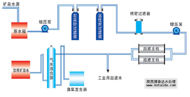 礦泉水源→原水箱→原水增壓泵→石英砂過濾器→活性炭過濾器→精密過濾器→高壓泵→超濾主機→工業(yè)用超濾水→臭氧發(fā)生器→氣水混合器→飲用礦泉水