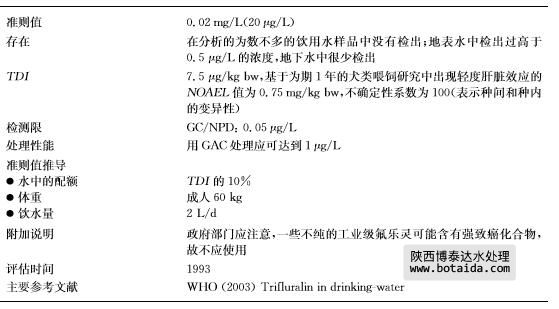 氟樂靈(CASNo.1582 09 8)是一種用于多種農(nóng)作物的芽前除草劑。它水溶性低,與 土壤有很高的親和力。然而,生物降解和光降解過程可能生成能污染飲用水源的極性代謝 物。盡管氟樂靈在許多國家都有使用,但關于飲用水污染的數(shù)據(jù)相當有限。