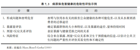 風(fēng)險評估、包括QMRA,首先從提出問題開始,其目的是確定各種可能的危害及危 害從源頭到消費者的各種遷移路徑。然后,將人接觸病原體的情況(環(huán)境濃度及攝入 量)和所選(或參考)生物體的劑量 反應(yīng)關(guān)系綜合起來以描繪出風(fēng)險的特征。結(jié)合其他 信息(社會、文化、政治、經(jīng)濟、環(huán)境等)就可提出一些優(yōu)先選用的管理辦法。為鼓勵利 益相關(guān)各方的支持和參與,在處理過程的每一階段,都能做到透明并主動溝通有關(guān)危險 性的信息是非常重要的。表7.3給出了危險性評估的一個例子并在下面進行詳細 描述。