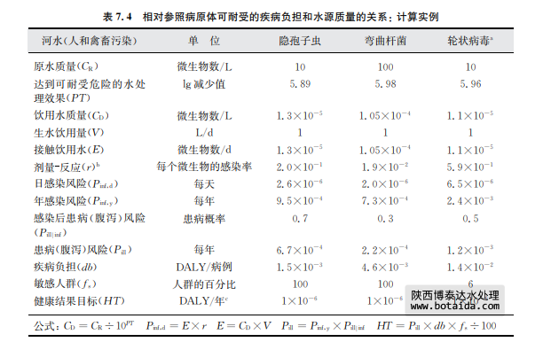 當需將一個病例中發(fā)生特定疾病的風(fēng)險轉(zhuǎn)化為疾病負擔(dān)時,可以使用DALY(metric disabilityadjustedlifeyear)(見第3章3.1)。這不但反映了急性終點反應(yīng)(腹瀉),也反映了 死亡率和更嚴重的終點反應(yīng)(如與彎曲桿菌有關(guān)的格林 巴利綜合癥,即急性感染性多發(fā)神 經(jīng)炎)。每個病例的疾病負擔(dān)變化很大。例如,每1000例輪狀病毒的疾病負擔(dān)在低收入地 區(qū)為480DALYs,而且還經(jīng)常發(fā)生兒童死亡。但在大多數(shù)居民都能得到醫(yī)療救助的高收入 地區(qū)僅為14DALYs/1000例(見附錄1支持性文件《世界衛(wèi)生組織飲用水水質(zhì)準則中公共 衛(wèi)生風(fēng)險量化》)。由于這種疾病負擔(dān)上的明顯差別,為了要達到相同的危險程度(以 DALYs/人/年表示),在相同水源質(zhì)量的情況下,在低收入地區(qū)就需要實施更嚴格的水處 理。表7.4中10-6DALY/人/年這樣的健康結(jié)果目標最好能與具體國情相結(jié)合。表7.4中 沒有免疫缺陷人群的計算數(shù)值(如 HIV/AIDS患者中的隱孢子蟲?。?,在某些國家,這些人群的數(shù)量還是很多的。3.2節(jié)中有更多關(guān)于DALY的信息,及關(guān)于如何將其用于獲取風(fēng)險 參考值。