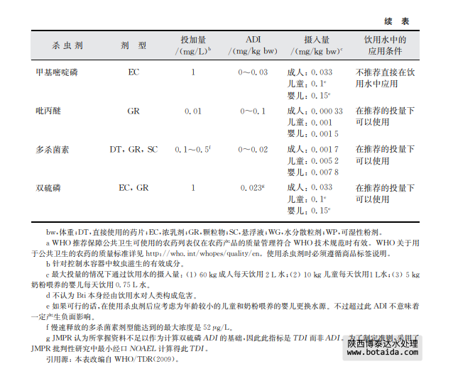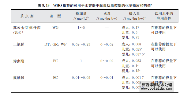 在許多國家,控制以昆蟲為媒介傳播的疾?。ㄈ绲歉餆幔┓浅V匾?,并且攜菌體(尤其是 蚊子)有機會在飲用水的貯藏和采集容器中產(chǎn)卵。盡管必須有防止這些攜菌體進入或在這 類容器中產(chǎn)卵的措施,但這種方式不可能完全有效或不能一直有效,在某些情況下就需要使 用蚊蟲幼蟲殺滅劑。