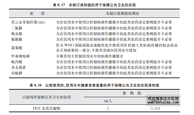 表8.17列舉了尚未制訂準則值用于保障公共衛(wèi)生的農(nóng)藥。二氯二苯基三氯乙烷 (DDT)在過去常被使用以保障公共衛(wèi)生,現(xiàn)在在某些地區(qū)將DDT再次引入以控制攜帶瘧疾 的蚊蟲(但不應(yīng)用在飲用水領(lǐng)域)。表8.18列出了DDT的準則值。表8.19列舉了各種殺 蟲劑產(chǎn)品的劑型,投量比和相應(yīng)的攝入量。 準則中所涉及的殺幼蟲劑的資料概覽詳見第12章
