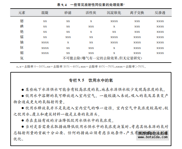 鈾、鐳以及氡都溶解于水。地表水(如江河湖泊)中含有氡,在水流過(guò)巖石和土壤過(guò)程中 易因攪動(dòng)作用釋放到大氣中。泉水和井水等地下水通常比地表水含有更高的氡,在比較極端的情況下,這類水源作為飲用水供應(yīng)可能含有極高含量的氡(見(jiàn)專欄9.5)。