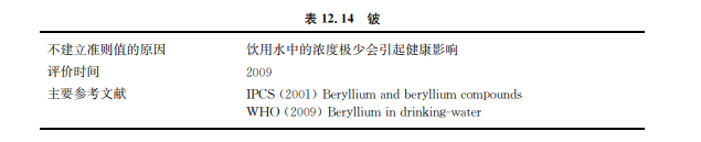 水中的鈹化合物主要來源于煤礦燃燒和其他使用鈹?shù)墓I(yè)釋放。地表水中鈹?shù)钠渌麃?源包括大氣中鈹?shù)某练e和含有鈹?shù)膸r石和土壤的風化作用。鈹在自然水體中大多數(shù)情況都 在痕量水平(見表12.14)。鈹氧化物及氫氧化物在正常pH值范圍內難溶于水.