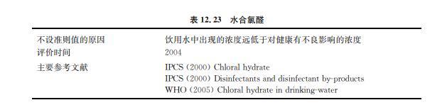 水合氯醛或者三氯乙醛是當(dāng)水中含有有機(jī)前體物(如富里酸和腐殖酸)時(shí),生成的氯 化消毒副產(chǎn)物(見(jiàn)表12.23)。有研究發(fā)現(xiàn)它在飲用水中的濃度可高達(dá)100μg/L,但是通 常濃度低于10μg/L。一般地表水中的濃度高于地下水,其濃度在水的輸送過(guò)程中可能會(huì) 增高。