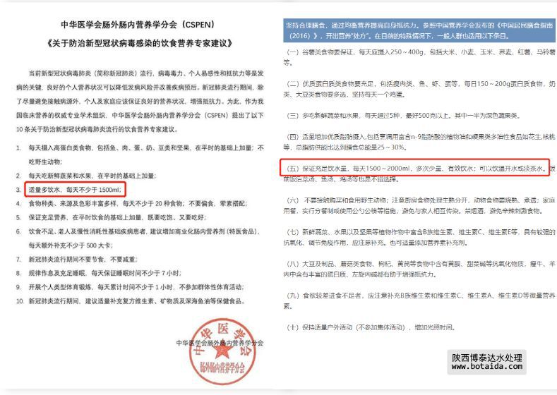 中國營養(yǎng)學(xué)會(huì)、中華醫(yī)學(xué)會(huì)、地方衛(wèi)健委等機(jī)構(gòu)發(fā)布的“防治新冠病毒感染的飲食指南”中,也多次提到要保證每天1500ml~2000ml的飲水量,多次少量,有效飲水。