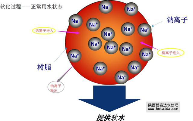 當(dāng)水中的鈣鎂離子含量高時(shí),離子交換樹脂可以釋放出鈉離子,功能基團(tuán)與鈣鎂離子結(jié)合,這樣水中的鈣鎂離子含量降低,水的硬度下降。硬水就變?yōu)檐浰?,這是軟化水設(shè)備的工作過程。