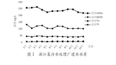 圖1是浙江某污水處理廠的2017年進(jìn)水水質(zhì)。通過分析,全年進(jìn)水COD平均值為240 mg/L,進(jìn)水BOD為111 mg/L,進(jìn)水總氮為43 mg/L,總磷為5.78 mg/L。來水中BOD/COD=0.46/0.45,通過可生化性分析,該進(jìn)水屬于易生化廢水。碳氮比分析中,BOD/TN=2.58;而在日常分析中,碳氮比低至2.0~2.1;相關(guān)研究表明,碳氮比在4~5時(shí),才能有較好的脫氮除磷效果。通過以上分析,本廠的進(jìn)水雖然易生化,但是碳氮比較低,特別是在進(jìn)水碳源較低的情況下,低碳源對于出水穩(wěn)定達(dá)標(biāo)造成一定的風(fēng)險(xiǎn),因此需要外加碳源作為進(jìn)水碳源的補(bǔ)充。