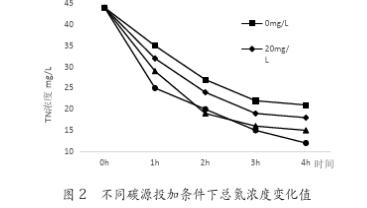 如圖2表示,葡萄糖作為外加碳源,在投加量分別為0、20mg/L、40mg/L和80mg/L情況下,總氮隨時(shí)間的變化值??偟S反應(yīng)時(shí)間的延長,濃度逐漸降低,最終出水濃度分別為21mg/L、18mg/L、15mg/L和12mg/L。在投加碳源后,系統(tǒng)對脫氮的效果有所提升,對總氮的去除率分別為52%、59%、66%和73%。投加碳源達(dá)到20mg/L后出水滿足《城鎮(zhèn)污水處理廠污染物排放標(biāo)準(zhǔn)》GB18918-2002中的一級B標(biāo)準(zhǔn),而且隨著投加量的增加,系統(tǒng)對總氮的處理效果增強(qiáng)。實(shí)驗(yàn)表明:碳源的投加,保證了硝化細(xì)菌,特別是異養(yǎng)型反硝化細(xì)菌對碳源的需求,提高的脫氮的效果。