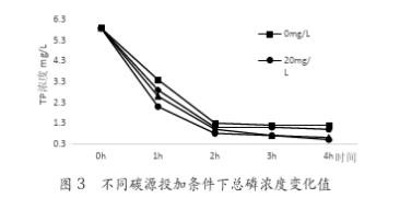 如圖3表示,葡萄糖作為外加碳源,在投加量分別為0、20mg/L、40mg/L和80mg/L情況下,總磷隨時(shí)間的變化值??偭纂S反應(yīng)時(shí)間的延長,濃度逐漸降低,最終出水濃度分別為1.2mg/L、1.0mg/L、0.6mg/L和0.5mg/L。在投加碳源后,系統(tǒng)對除磷的效果有所提升,對總磷的去除率分別為80%、83%、90%和92%。投加碳源達(dá)到20mg/L后,出水均滿足一級B標(biāo)準(zhǔn),而且隨著投加量的增加,系統(tǒng)對總磷的處理效果增強(qiáng)。