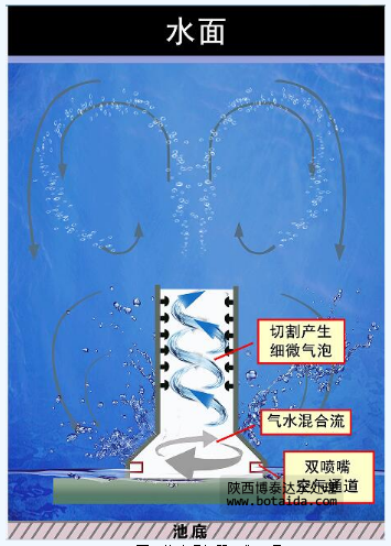旋流曝氣器在工作過程中,氣體從底部法蘭口進入后從緊貼鐘型曲面的 2 個噴嘴噴出形成旋流效果,以極快的速度沿著鐘型壁面向上加速回旋。由于鐘型上側漸漸狹窄,空氣獲得極大的加速度和沖擊力。 由于氣體作用,混合液在筒內(nèi)、外循環(huán)流動,氣液上升過程中,被筒內(nèi)部結構多次碰撞切割,形成大量超微氣泡,且與周圍的泥水混合物充分混合,增加了氧氣的傳質(zhì)速率和氧利用率;充分混合的氣水猛力向上沖出,強烈的循環(huán)水流使部分小氣泡和水流返回池底,同時使底部淤泥參與循環(huán),因而整個曝氣池內(nèi)無充氧盲區(qū),實現(xiàn)了曝氣池容積利用最大化。(見圖3)