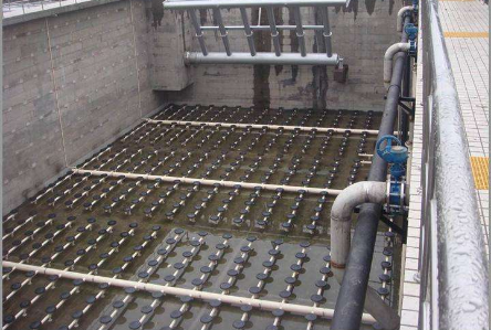 鼓風(fēng)曝氣設(shè)備:是使用具有一定風(fēng)量和壓力的曝氣風(fēng)機(jī)利用連接輸送管道,將空氣通過擴(kuò)散曝氣器強(qiáng)制加入液體中,是池內(nèi)液體與空氣充分接觸。