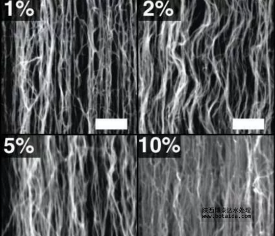 上圖為碳納米管涂層的掃描電子顯微鏡(SEM)圖像。 這些圖像顯示不同體積分?jǐn)?shù)的一大片碳納米管樣品。 左上方是制成的樣品,體積分?jǐn)?shù)為1%(意味著總體積的1%被納米管占據(jù))。 其他圖像顯示濃度分?jǐn)?shù)為2%,5%和10%的密度較大的樣品。 每個(gè)圖像上的比例尺是500納米。 資料來(lái)源:麻省理工學(xué)院
